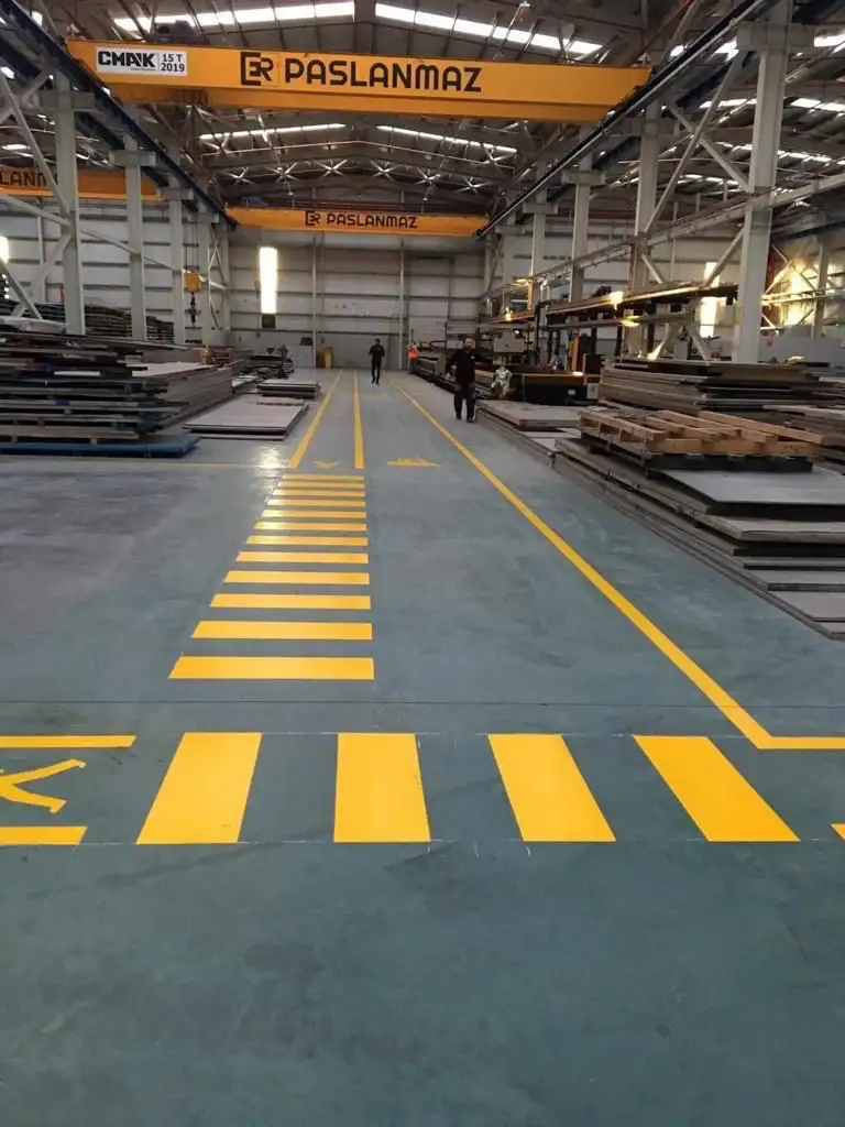 İş Sağlığı ve Güvenliği (İSG) standartlarına uygun yapılan fabrika içi yol çizgileri, çalışma ortamını daha düzenli ve güvenli hale getirir.