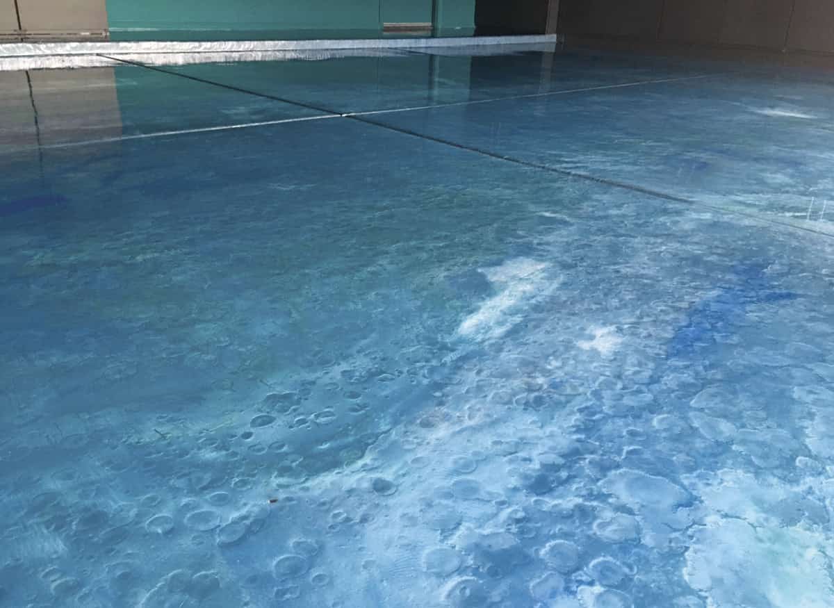 Görselin üzerine dökülen şeffaf epoksi, zemine derinlik kazandırır ve aynı zamanda zemin için dayanıklı bir koruma tabakası oluşturur. Eğim ayarı bu aşamada kritik öneme sahiptir.