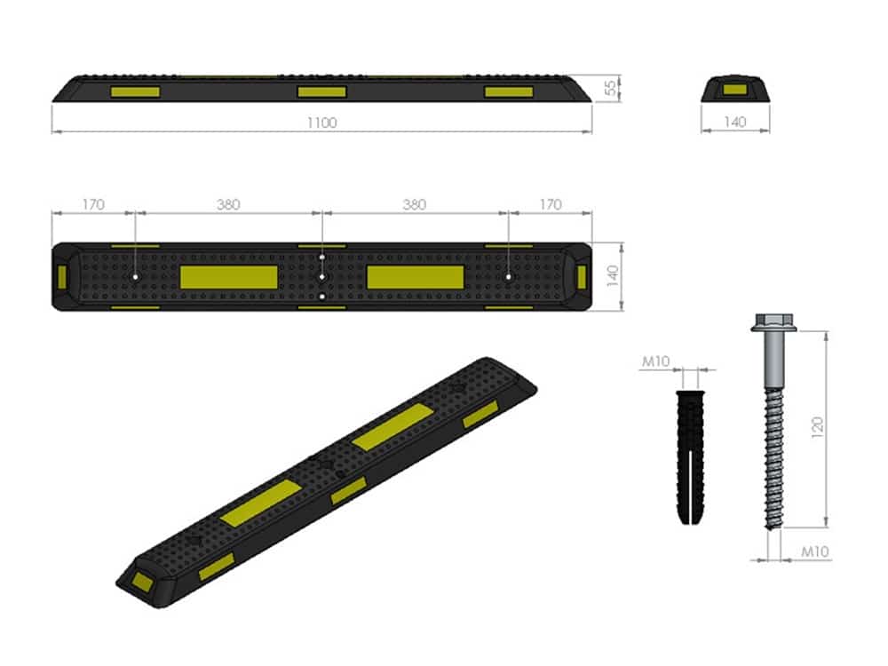 auçuk Yol Bölme Butonu kauçuk malzemeden üretilmiş olup ölçüleri 110 x 14 cm ebadında dikdörtgendir. Ürün yüksekliği 5 cm dir. Ağırlığı 6,85 kgdır. Kauçuk Yol Bölme Butonu 3 adet vida ve dubel ile ile doğrudan zemine monte edilir. Üründe toplam 10 adet reflektif bant bulunur. Kauçuk hammaddesi nedeniyle esnek ve çarpmalar karşısında dayanıklı ve uzun ömürlüdür.